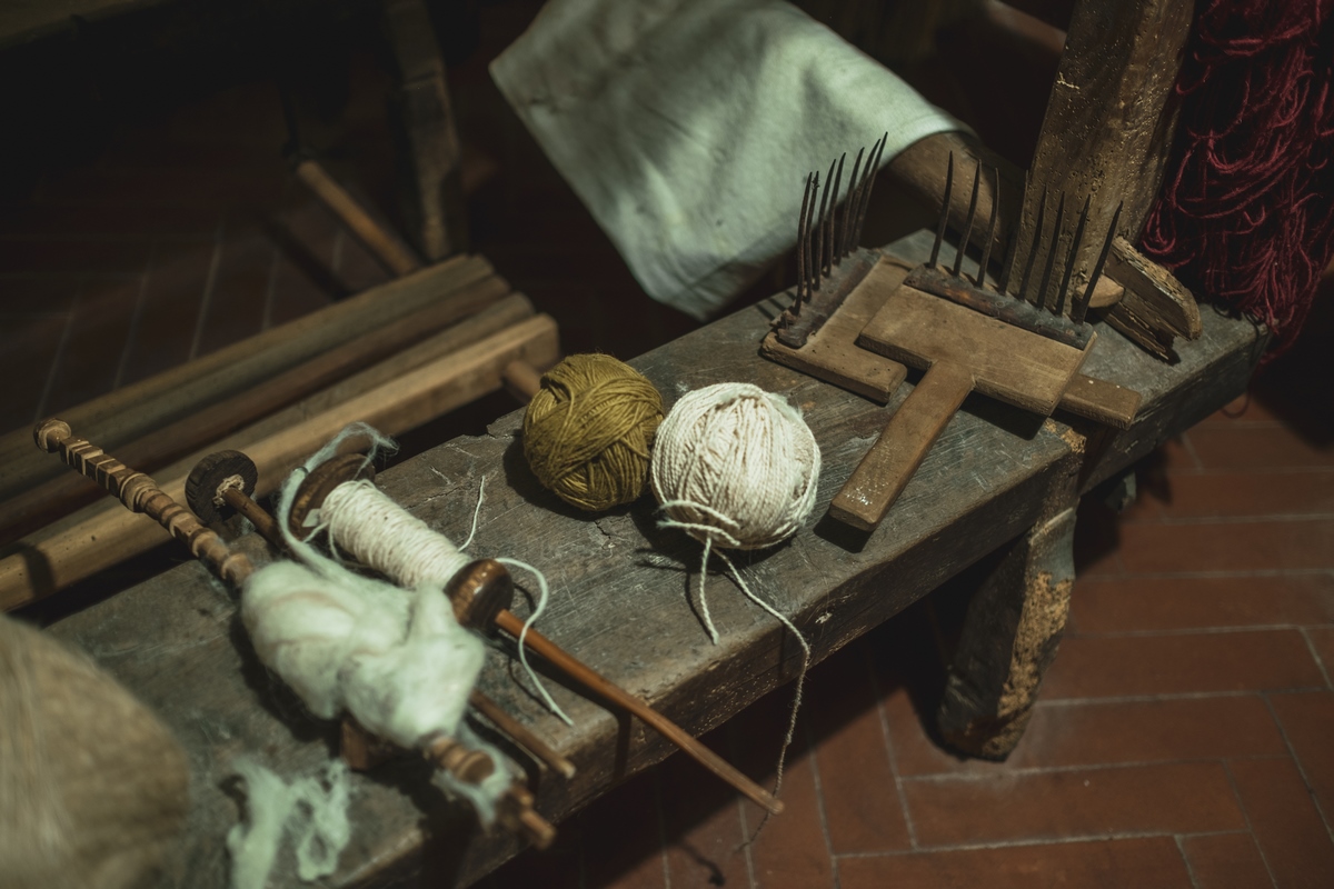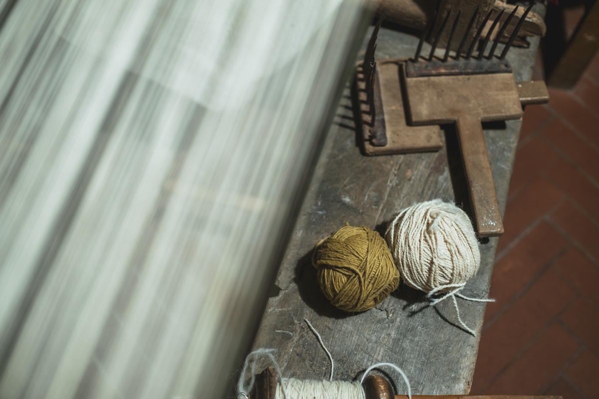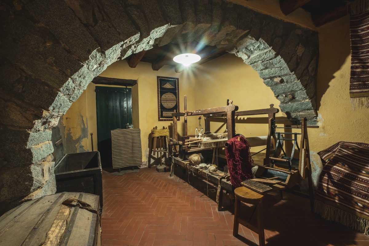 Cet espace donne sur la salle du tissage, qui comprend des coffres, un rouet en bois et des bobines typiques qui permettaient d’acheminer la trame vers la chaîne, ainsi qu’un métier à tisser horizontal traditionnel que les femmes utilisaient pour donner forme aux étoffes des différentes tenues. Sur les murs, des exemplaires des couvertures en laine typiques tissées sur métier vertical, appelées sas vrassatas, complètent l’installation; dans un coin, les outils du cordonnier.