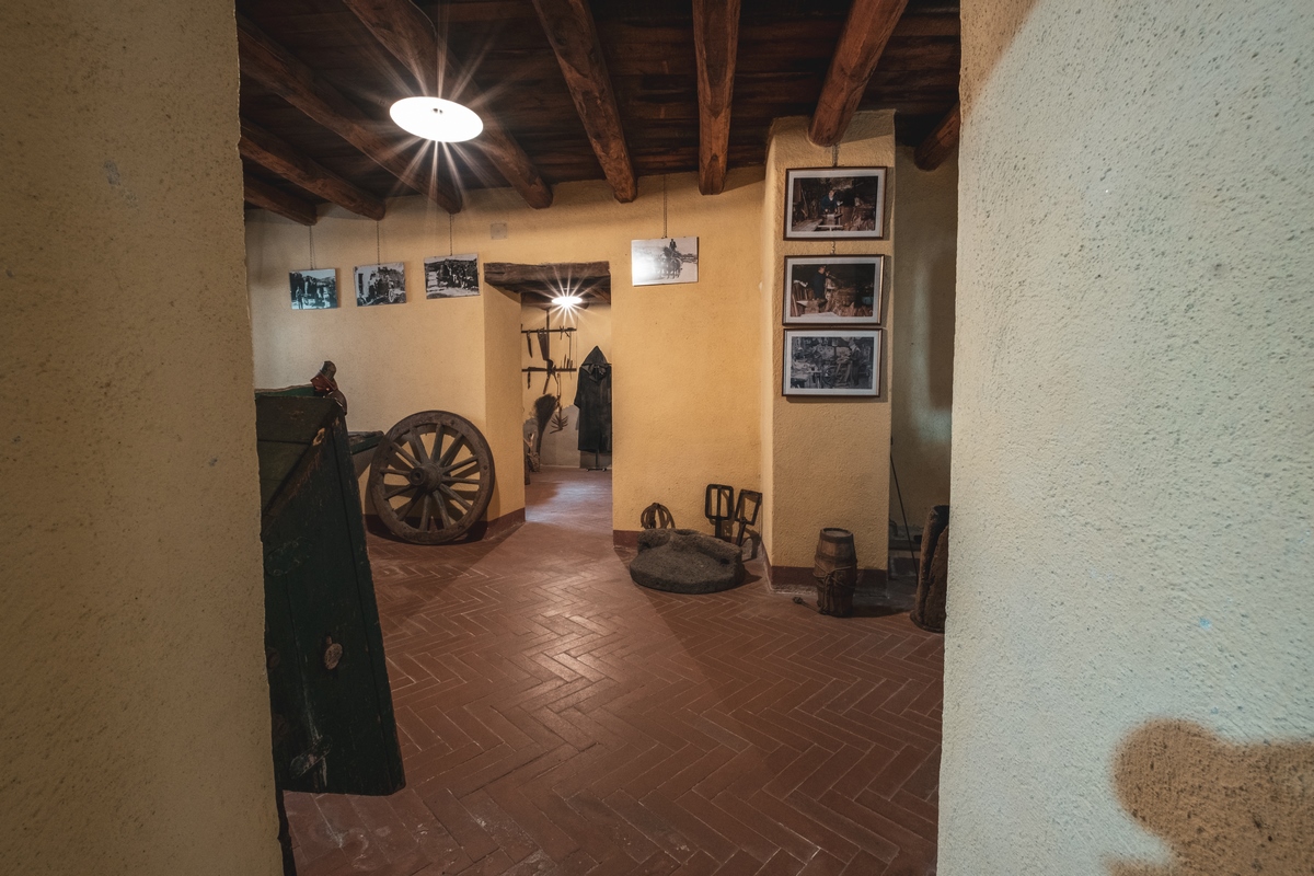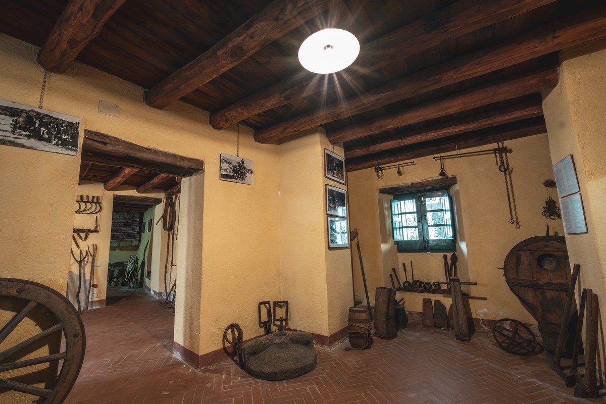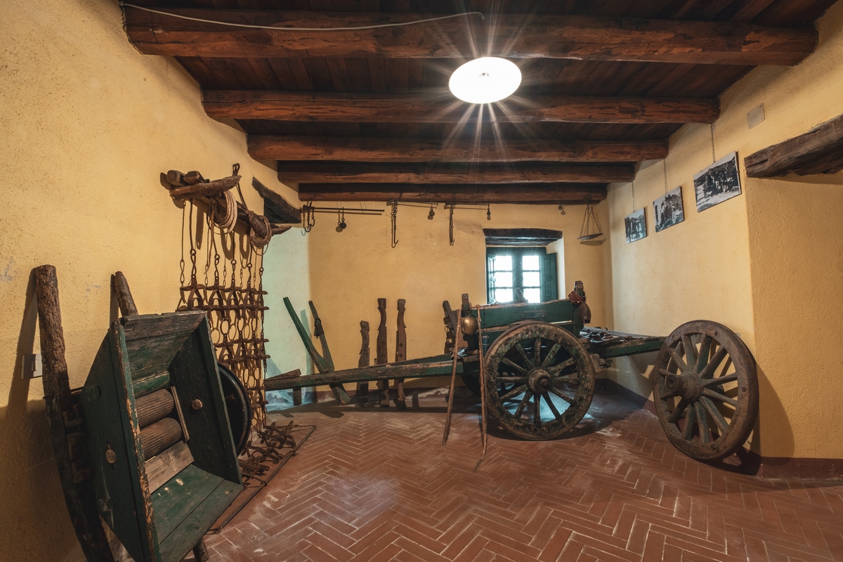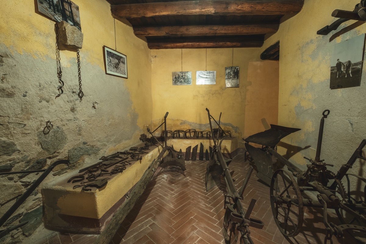 Le parcours s’ouvre sur une pièce qui abrite différents types de charrues, en bois et en fer, ainsi que des photographies d’époque aux murs. L’on accède ensuite à un autre espace où une grande charrette à bœufs est entourée d’outils de forgeron, de jougs et d’instruments les plus divers que les paysans utilisaient pour travailler la terre et moudre le blé.