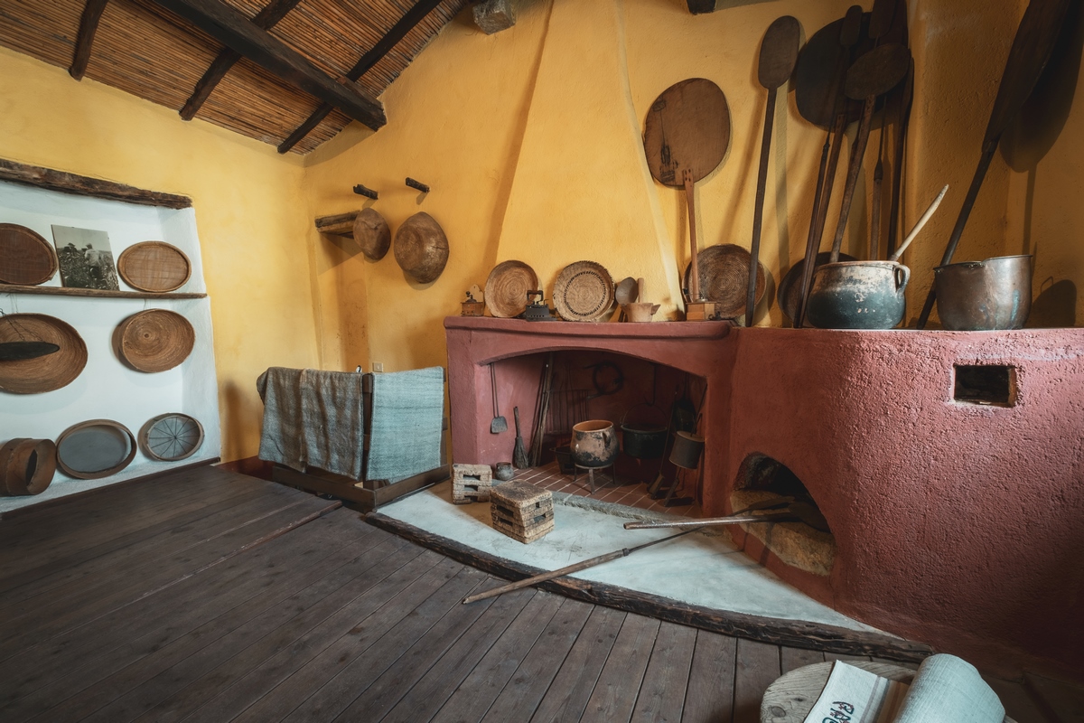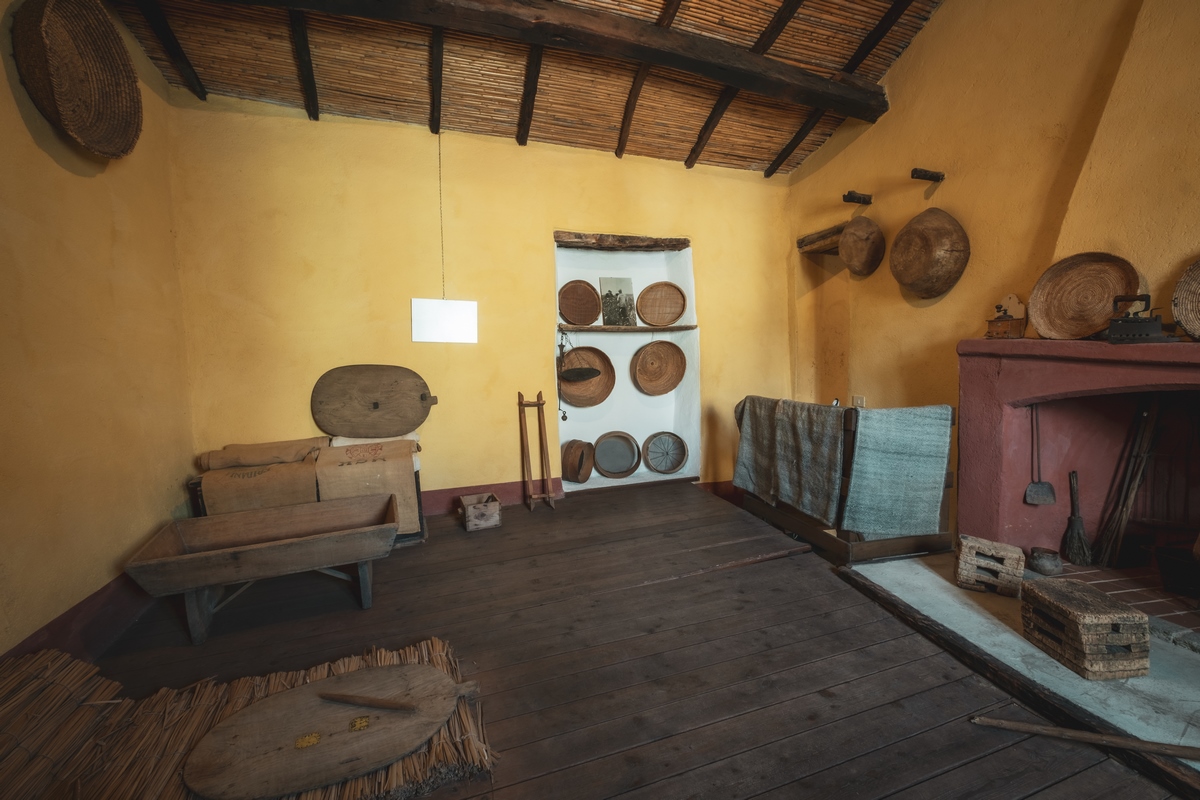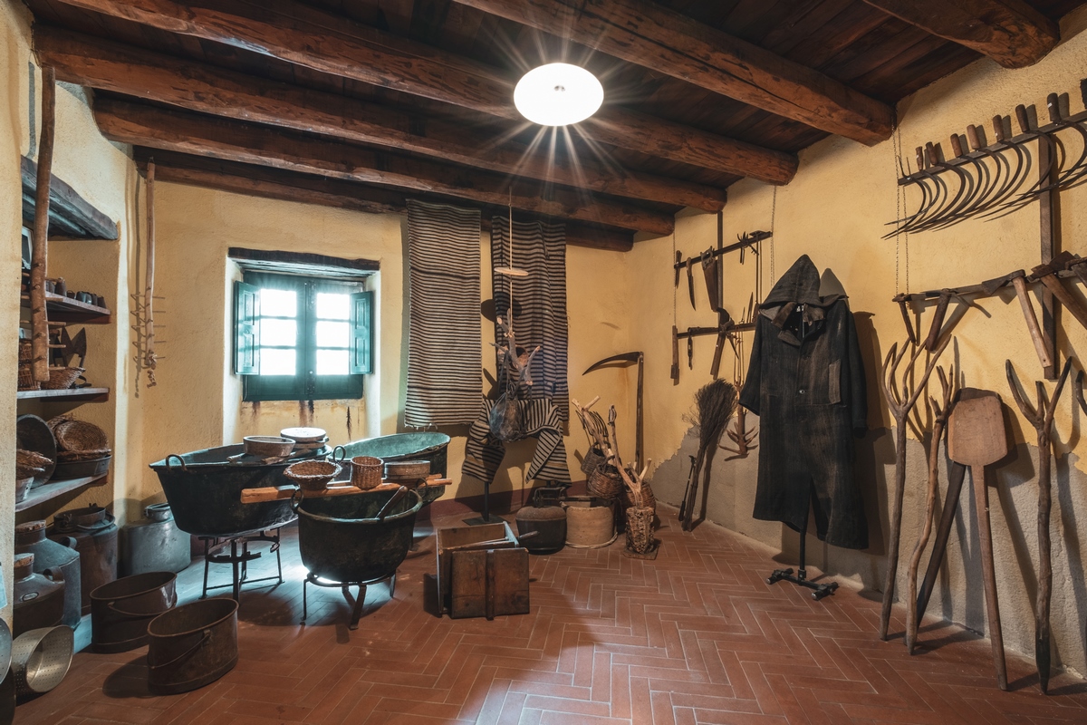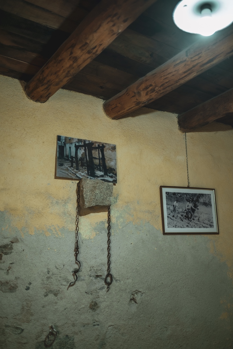 Le parcours s’ouvre sur une pièce qui abrite différents types de charrues, en bois et en fer, ainsi que des photographies d’époque aux murs. L’on accède ensuite à un autre espace où une grande charrette à bœufs est entourée d’outils de forgeron, de jougs et d’instruments les plus divers que les paysans utilisaient pour travailler la terre et moudre le blé.