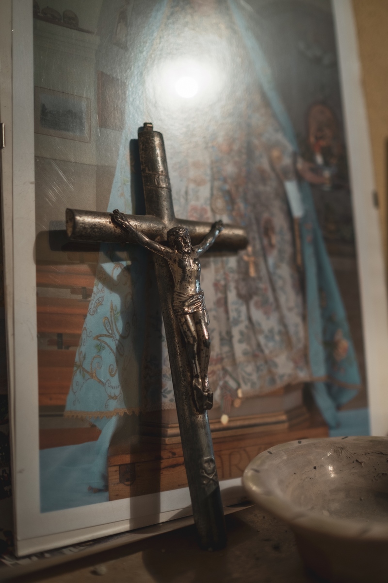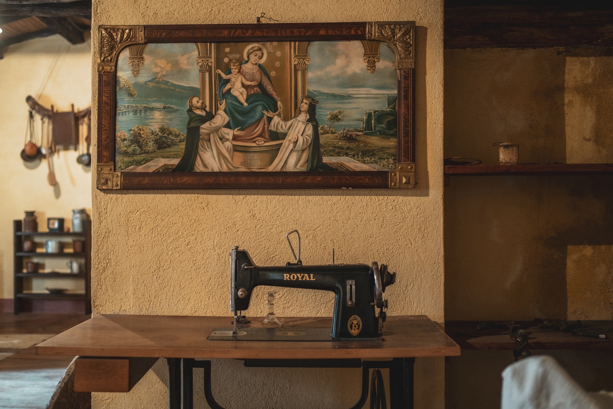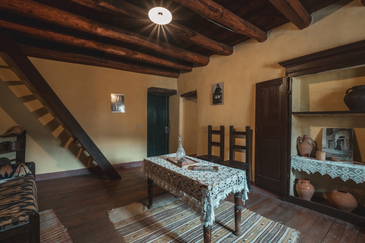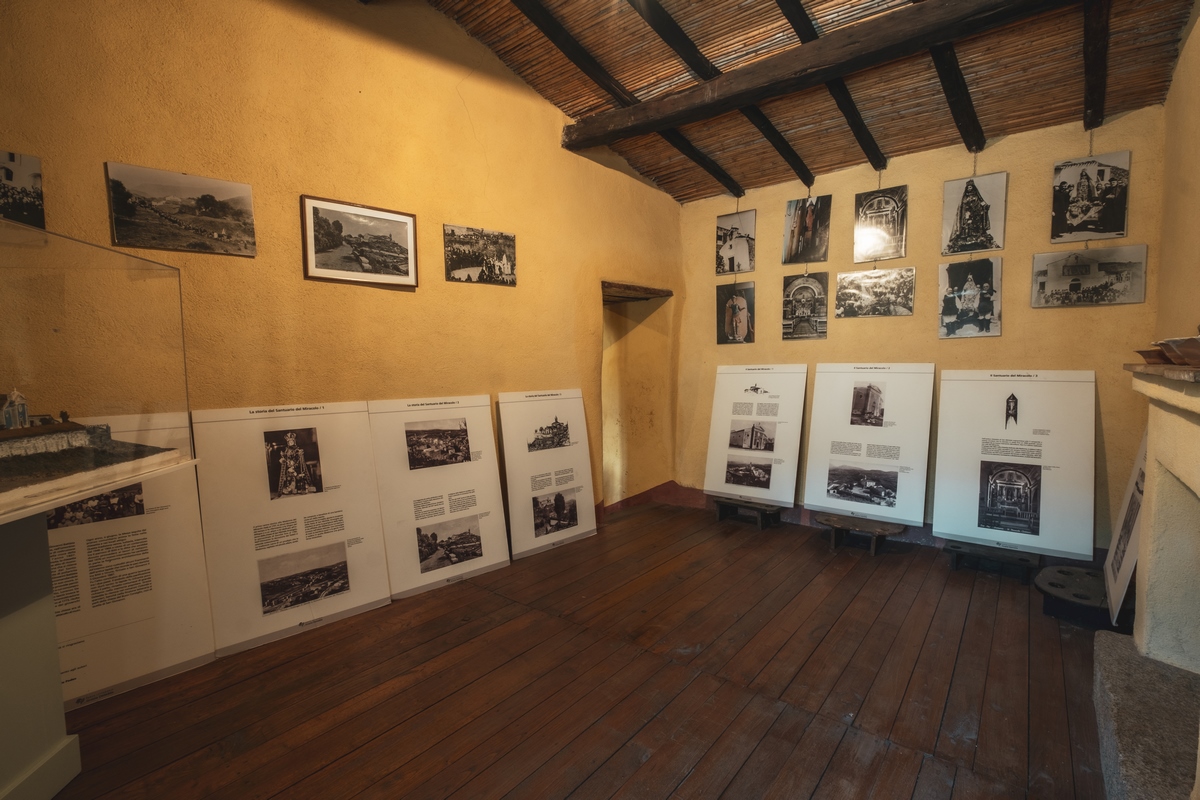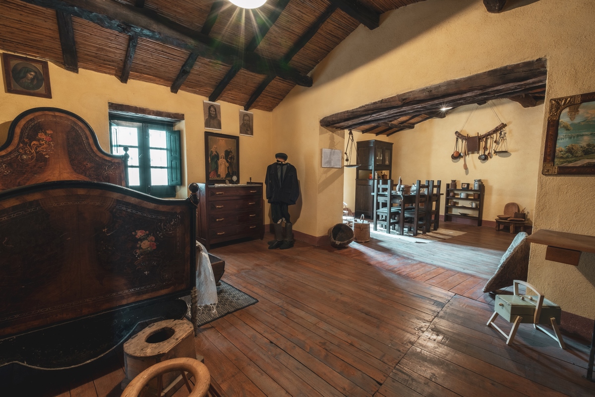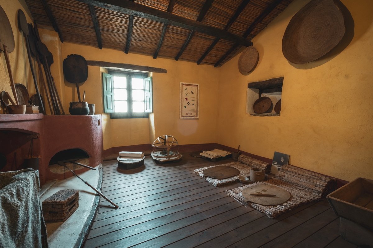 L’étage supérieur est quant à lui consacré à la dimension plus intime de la maison. La visite commence par une pièce destinée à accueillir les invités, qui abrite la reproduction d’un salon sarde ancien, avec une commode en bois, une table ornée d’une nappe blanche brodée posée au centre d’un tapis traditionnel, une armoire murale, un coffre sculpté et des chaises adossées aux murs. À partir de là, une porte s’ouvre sur la cuisine qui présente une grande table mise, des ustensiles de cuisine suspendus au mur et rangés dans les coffres ou près de la cheminée. La cuisine communique avec la reconstitution d’une chambre à coucher où l’on peut admirer un ancien lit sarde et les berceaux caractéristiques en bois. Juste après, un espace comprend des panneaux descriptifs et des photographies qui permettent de contextualiser et de mieux comprendre certains aspects et détails du musée par rapport à la vie de la communauté, notamment du point de vue sacré et des fêtes dans les sanctuaires champêtres. Enfin, la visite de l’étage supérieur se conclue sur une pièce consacrée à la fabrication du pain, notamment le «carasau» dont les caractéristiques permettaient de le conserver longuement. Les paniers en asphodèle suspendus aux murs, ainsi que les pelles de boulanger, tout comme la cheminée et le four, restituent pleinement la signification de cet espace de travail.