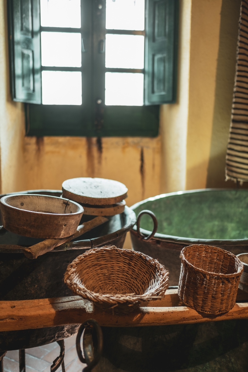 La visite se poursuit dans une pièce contiguë, où sont reproduites les phases de la fabrication du fromage, avec les grands récipients utilisés pour réchauffer le lait et les moules pour modeler les formes de «pecorino», le fromage de brebis.
