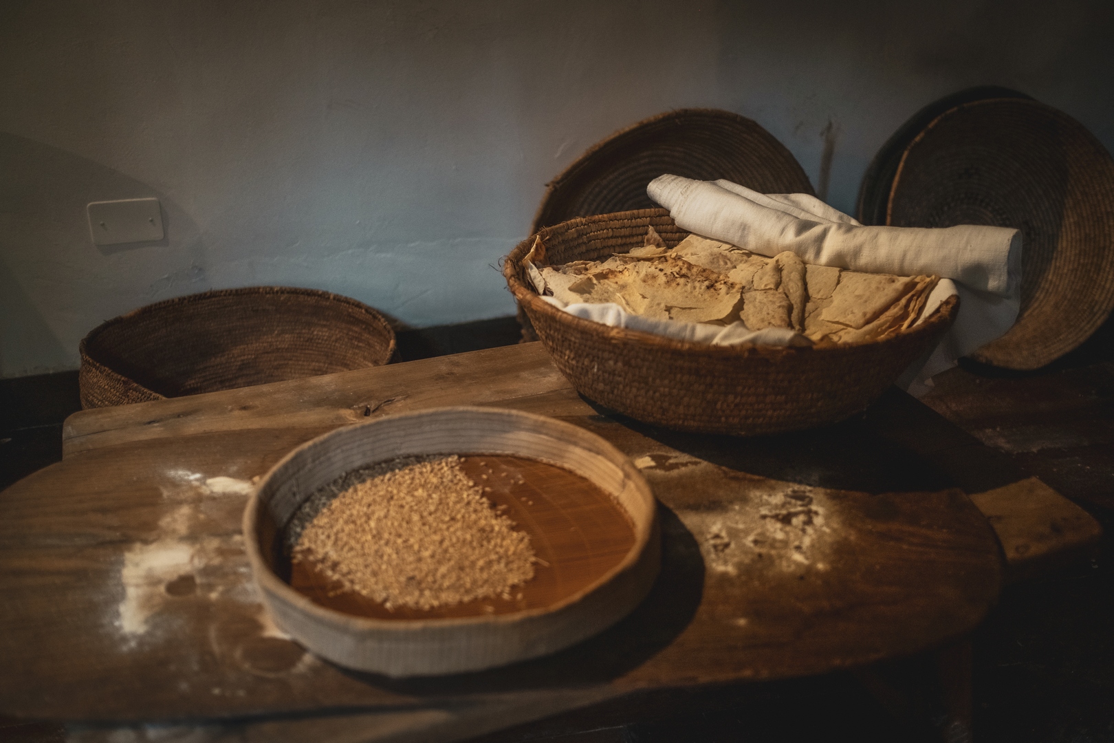 La première section de l’exposition raconte la vie du berger nomade et de sa famille. L’épouse, qui reste seule pour s’occuper de la maison et des enfants, joue un rôle fondamental: elle fabriquait le pain (quotidien et de cérémonie), filait et tissait.
